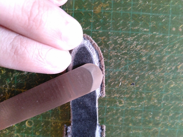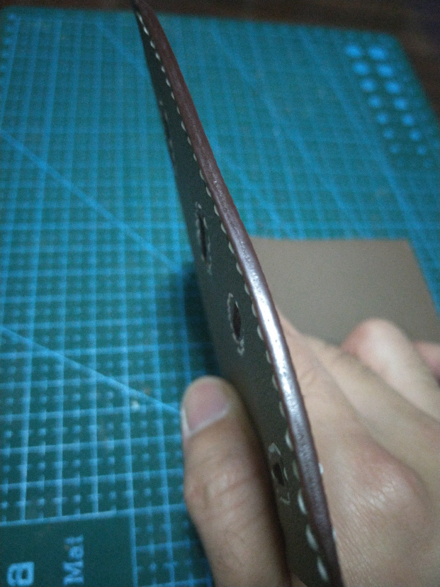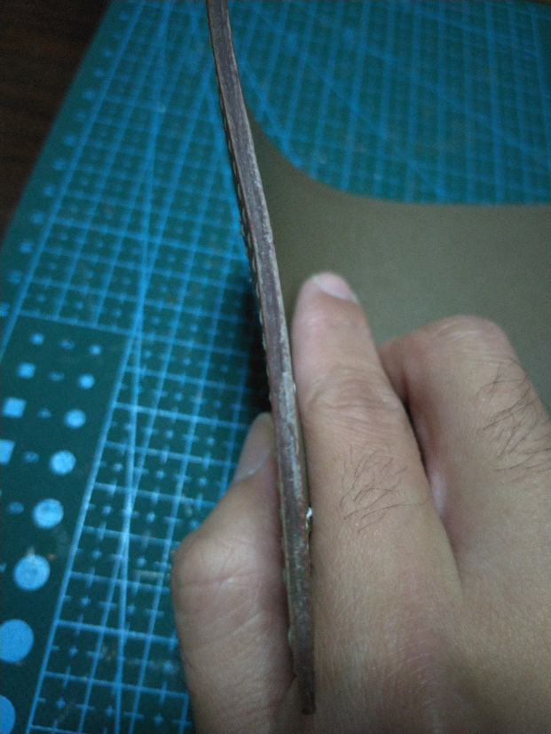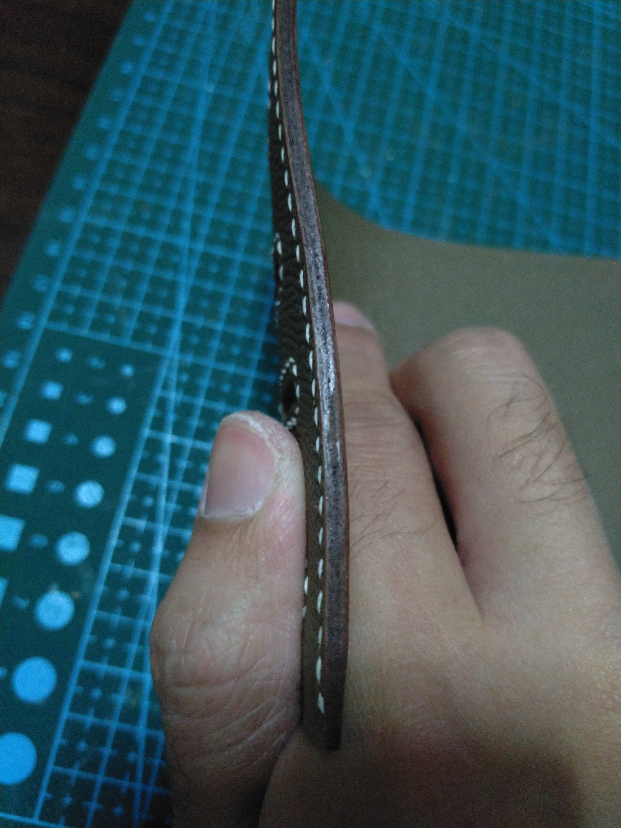 如果没有烫边机,也可以用打磨的方式来处理边油。由于一开始我是植鞣入坑,所以边油还是有一点植鞣的习惯在里面。首先手指沾一点水在皮边切面上擦一下,用打磨条的细面(大概180目吧,记不太清了)打磨成这样。