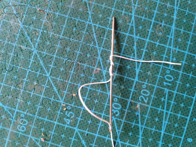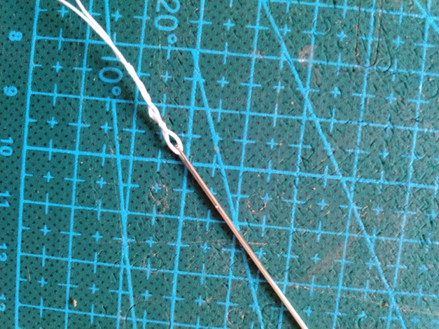 先说穿针,如图,线从针孔穿过去,针尖从线里穿三次,撸下来拧一拧…