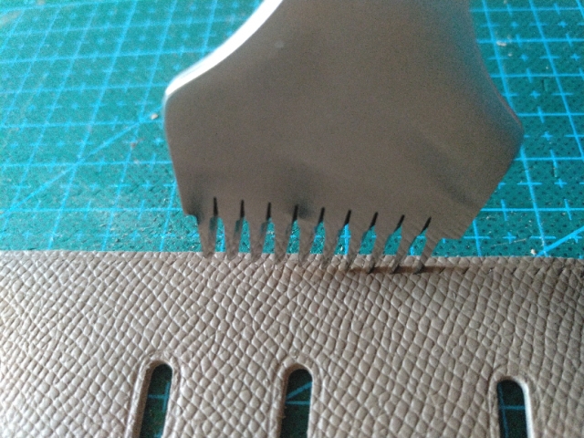 一般精细着来,可以在打版的时候,就算好斩孔;如果怕最后几个孔不均匀,可以留个5、6个孔的距离,先用两齿的斩量好距离,在正常斩距稍远或稍近一点,挪动非常少距离的位置轻敲一下(另一个斩齿翘一点),再把另一个斩齿套到前面的孔打斩就好。