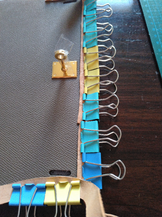 边缘贴合后用夹子夹住,随便找块废皮子垫一下夹子,或者可以给自己的夹子“穿上衣服”。