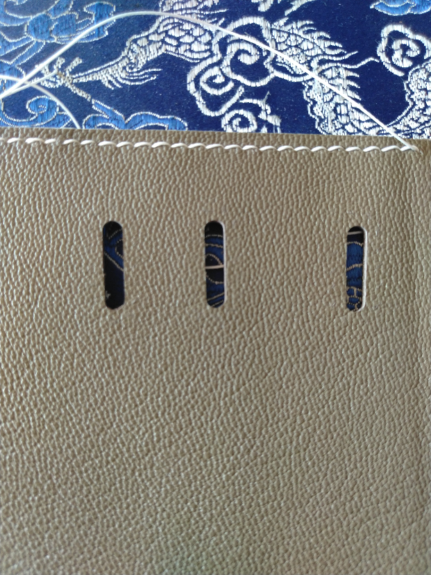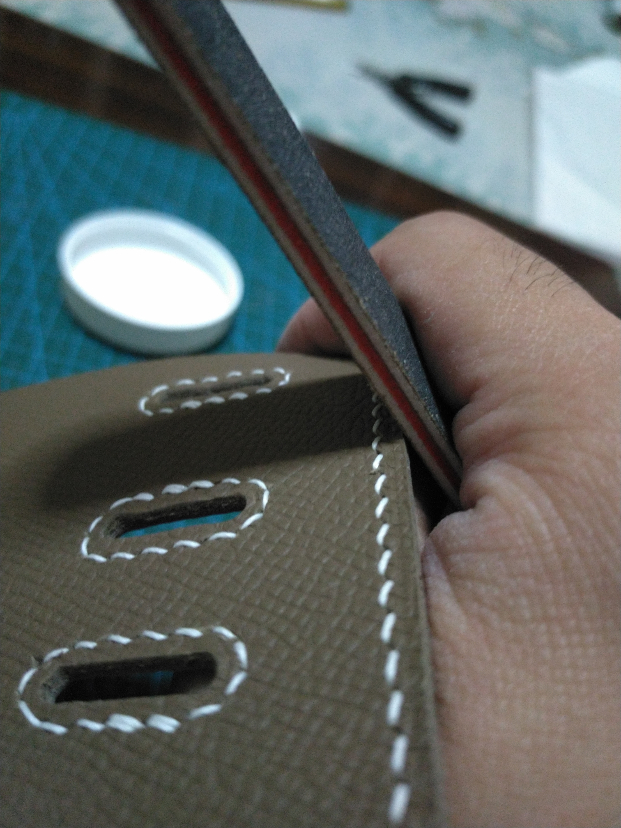 斜削如果怕把皮子削透的话,建议一点点来,慢慢削到自己满意的厚度,和段削一样,不需要很大的推刀力度,而是左右滑动削薄刀就可以了,即使比较难按住的小部件,也是要注意不要把刀口冲着手的。