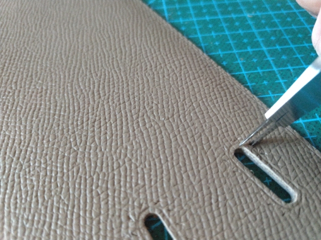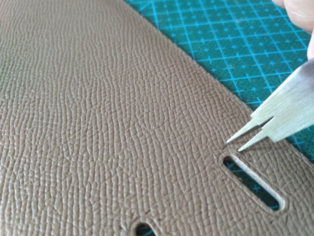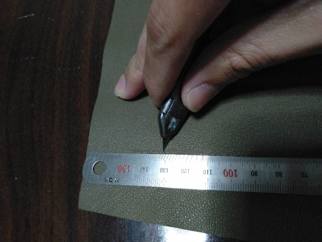 当然贴之前要把两边打磨毛躁,保证贴合牢固,或者用刀片刮掉表面涂层也可以。在需要的位置用钢尺压住,刀头搭在皮面上前后拖动就可以了,下面是我平时用美工刀刮涂层的习惯,个人比较喜欢用拇指食指捏刀,中指向前推皮子带着刀前后动,这样比起用大臂带着刀走,最大的移动距离比较短,手抖的话一般都还有救。而切割的时候长线还是大臂带着刀走,小范围的,比如弧线等部分,习惯去找一个小支点来缩短最大的移动距离。