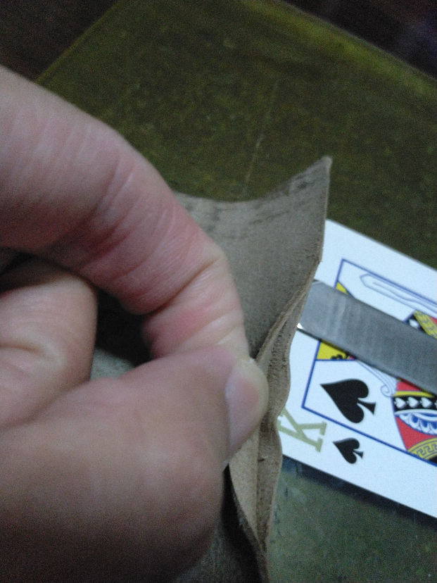段削一般我习惯用钢尺压着皮子,找个需要厚度的卡片(比如扑克)用双面胶粘在各种板子上,刀只需要用很小的力度往前推,前后来回滑动,刀子够快的话,很容易就可以削薄的很好了。