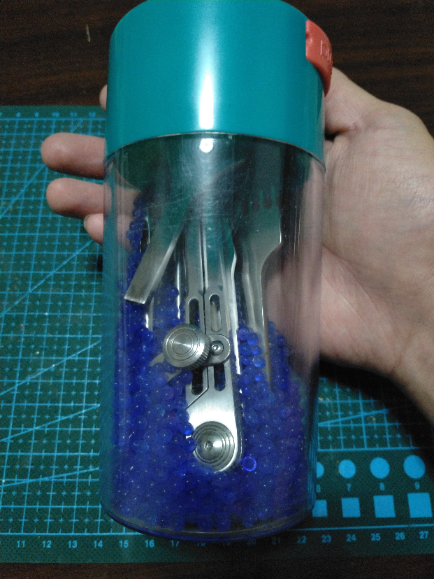再一个是这个台湾专利的密封罐(好吧,之前是装咖啡豆的),里面放的是变色硅胶干燥剂,干燥的时候是蓝色,吸湿后渐渐变成粉色,烘干之后可以反复使用,我一般都会把斩和冲子放到这里面。