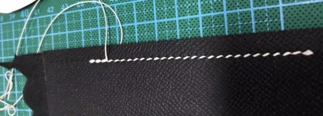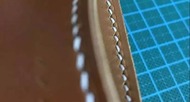 4)在缝比较薄的皮子的时候,比如双面对贴才1.5mm厚的法羊。这个时候,你要注意,先拉没有交叉的那一面的线(因为没有交叉那一面的线最容易拉成直线),再拉有交叉的那一面的线(因为两根线有交叉,所以无论怎么拉,都是波浪线)